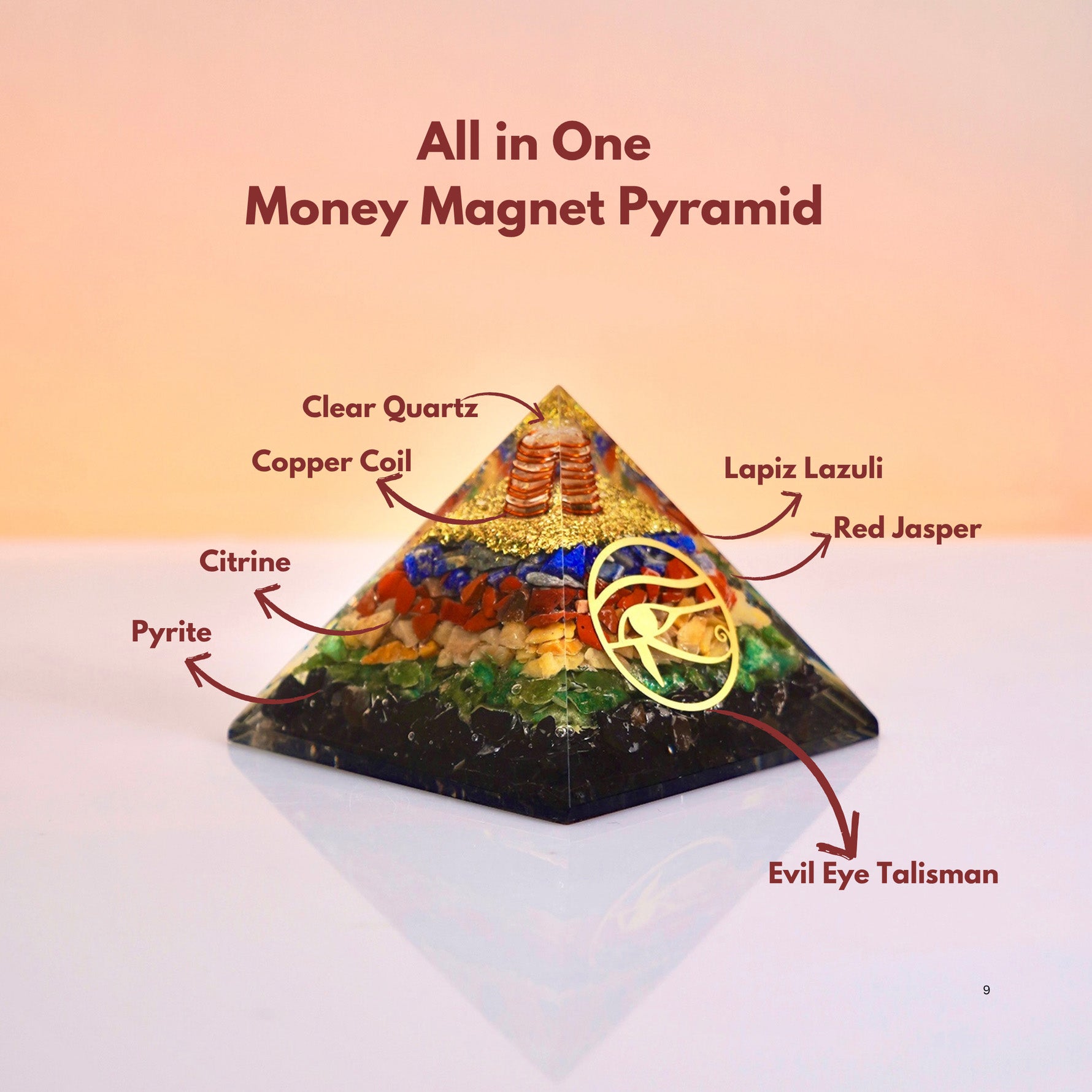 Draws wealth, protects energy, and promotes balance. Includes Pyrite, Citrine, Red Jasper, Green Jade, Lapis Lazuli, Clear Quartz, and a Copper Coil to harmonize energy flow.